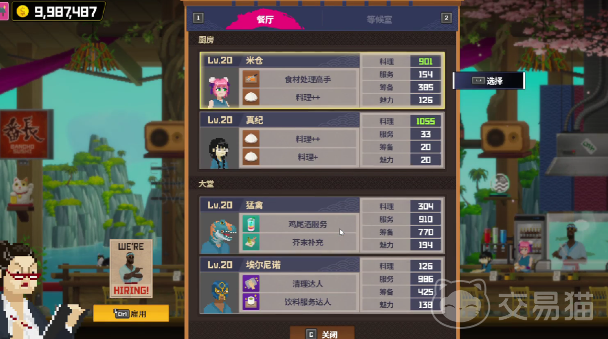 如果玩家并不知道前期应该培养怎样的大堂经理或者是餐厅厨师,可以直接考虑真纪、米仓作为厨房的帮手,而大堂直接选用猛禽和埃尔尼诺,在大堂经理的选用方面,玩家可以直接选取杰瑞,实际上游戏当中除了这以上几个能力较强的角色,其他的角色都是可以任意进行迁移的。