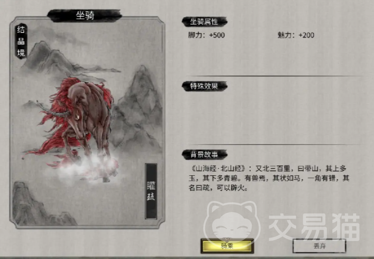 结晶期的疏与金丹期的当康进一步增强了玩家的行动力。疏提供500脚力和200魅力,作为中期坐骑,其属性虽然平衡,但获取方式较为常规,适合注重效率的玩家。而当康则以600脚力和150魅力成为金丹期的标志性坐骑,其神兽般的威严造型在商店中即可购买,彰显了修士身份的跃升,同时兼具实用性。到了更高境界,坐骑逐渐呈现出更强的属性和独特的外观。例如,具灵境的驺吾以750脚力和300魅力成为玩家在这一阶段的可靠伙伴,其传说中的神兽形象令人印象深刻。紧随其后的是元婴期的龙鱼,提供800脚力和500魅力,是一款兼具速度与魅力的高效坐骑,适合修士在广阔地图中快速穿梭,追逐更高的修行目标。