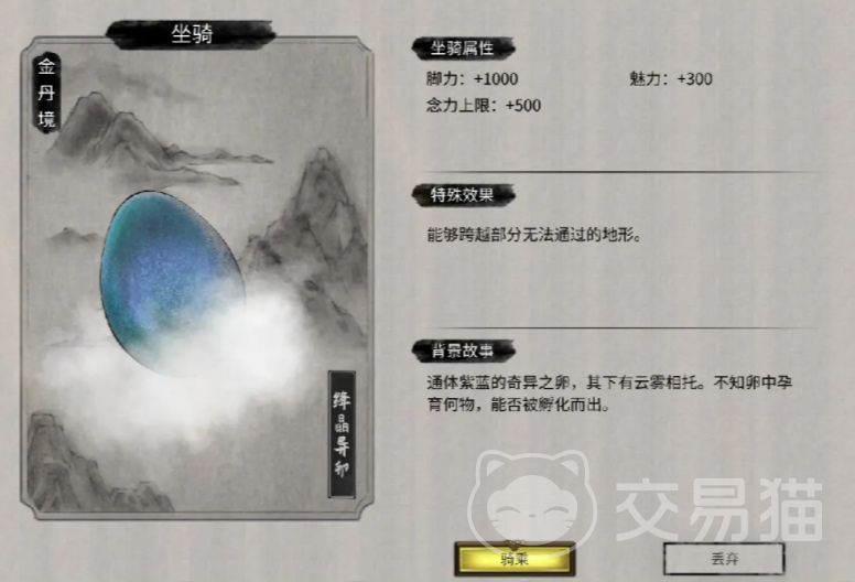练气期的飞舟与祥云是玩家修炼初期的理想选择。两者均能提供高达1000的脚力以及400的魅力加成,无论是用来赶路还是提升与NPC的好感度都表现出色,这两款坐骑目前只能通过修改游戏文件获得,官方尚未开放正常获取途径。飞舟以其简洁流畅的设计象征着修仙者的自由,而祥云则以柔和的光晕营造出仙气缭绕的氛围,二者的外观都为玩家初入修行带来独特的视觉体验。