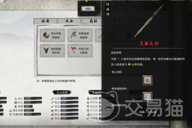 在材料集齐后,玩家可前往工坊,通过炼器系统完成皇极天剑的打造。这件法宝炼成后,核心技能便是召唤出24道灵剑,灵剑会在玩家周围随机穿梭,对路径上的敌人造成多段伤害。灵剑的攻击倍率较高,并且对密集敌群有着极佳的打击效果,能够迅速清理大量小怪。但需要注意的是,皇极天剑的伤害输出依赖灵剑与敌人的碰撞频率,因此在面对高移动或单体敌人时,可能会因命中效率下降而表现稍显不足。