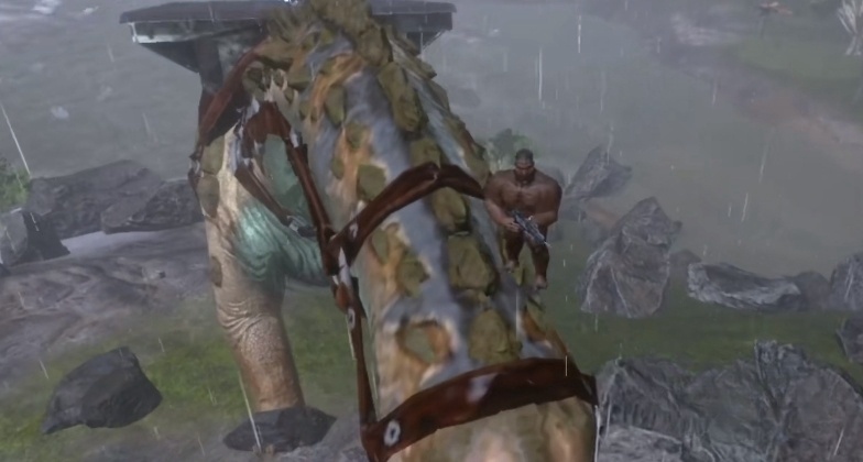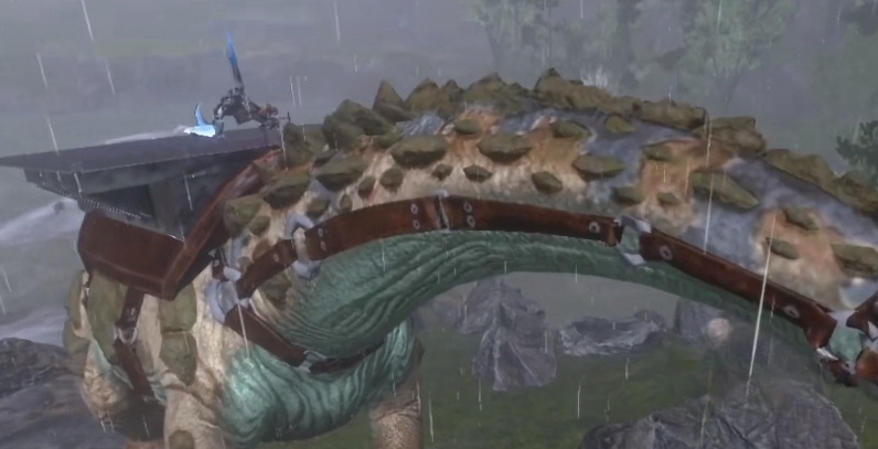 当泰坦龙的生命值降至一定程度时,玩家需迅速使用特殊的驯服道具来完成驯服过程。驯服后的泰坦龙不仅拥有超高的承载能力,还能够用作移动战争堡垒,其平台鞍具可以搭载建筑,成为玩家探索和战斗中的终极利器。然而,泰坦龙的驯服状态是有限的,驯服后它的生命会逐渐流失,直到最终死亡,因此驯服泰坦龙更多是为了短时间的绝对战斗力,而非长期陪伴。