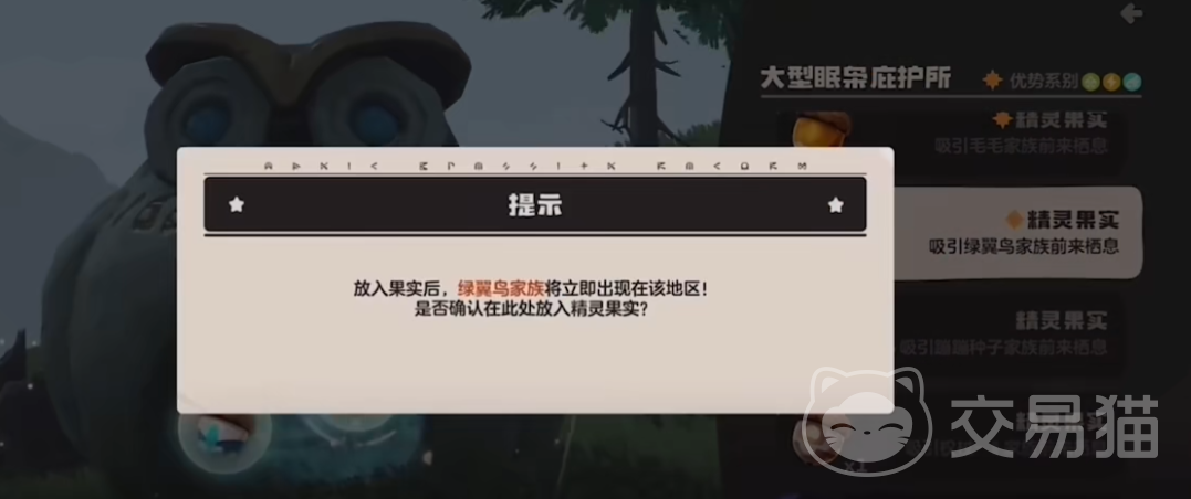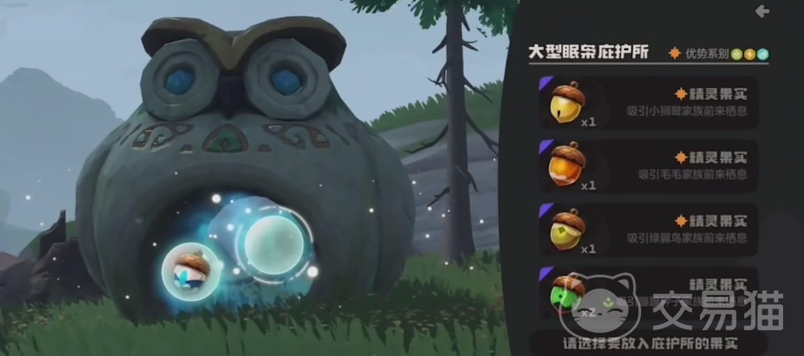 许多人在大地图中打开之后看不到眠枭庇护所,是因为这不会直接显示在地图上面。这时要不断进行地毯式搜索,当你发现一个猫头鹰形状的设施之后,就记得要在地图上留下一个标识。这样下次找时就不用费力搜寻,最后看到后让你所拥有的宠物果实放进去。