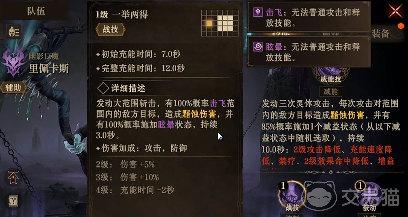 除了被动技外,里佩卡斯还拥有一举两得这个战技,可以发动大范围斩击,有100%的概率击飞范围内的敌方目标,并造成基于攻击力和防御力加成的黯蚀伤害。此外,还有100%的概率施加眩晕状态,持续3秒,实际的效果会随着技能等级提升。该技能还具有一些特殊的附加效果,能在一定程度上增加角色的战力。它的威能技幽灵戏耍,使用时会发动三次灵体攻击,每次攻击对范围内的敌方目标造成黯蚀伤害,同时有35%的概率减少目标的威能,并且有85%的概率施加一个减益状态。