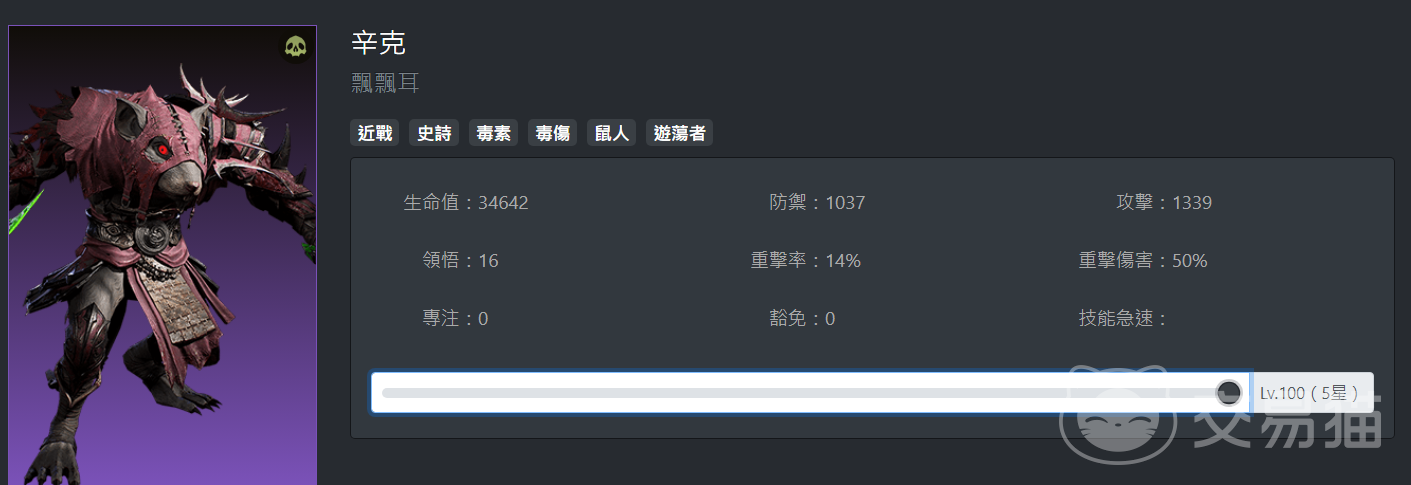辛克作为鼠人游荡者,不仅精通毒术,还因其史诗的稀有度,成为平民玩家轻松获取的强力选择。通过太阳季轮替召唤卡池,玩家可以较容易地抽取并培养这名角色。在满星100级时,辛克的基础属性为:生命值34642、领悟16、防御1037、重击率14%、攻击力1339、重击伤害50%。