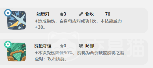 然后还有一个进攻技能叫做剁地,可以对敌方精灵造成物理伤害。然后还有防御技能—能量守恒,用了后可以降低90%受到的伤害,是一个关键的物理防御技能。然后还有空间压迫,能够造成物理伤害,并叠加一层星陨。