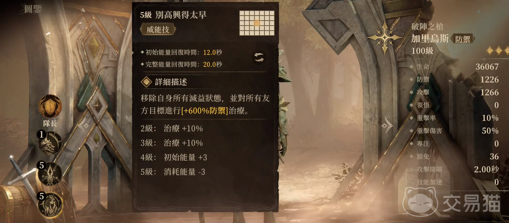 加里乌斯是团队中不可缺少的治疗位,作为自选紫色史诗角色,他的大招“别高兴得太早”能够移除自身所有减益状态,并为全队进行全屏覆盖治疗。这对冰光队尤为重要,因为这意味着玩家不需要再专门安排一名稀有的冰属性护盾角色。