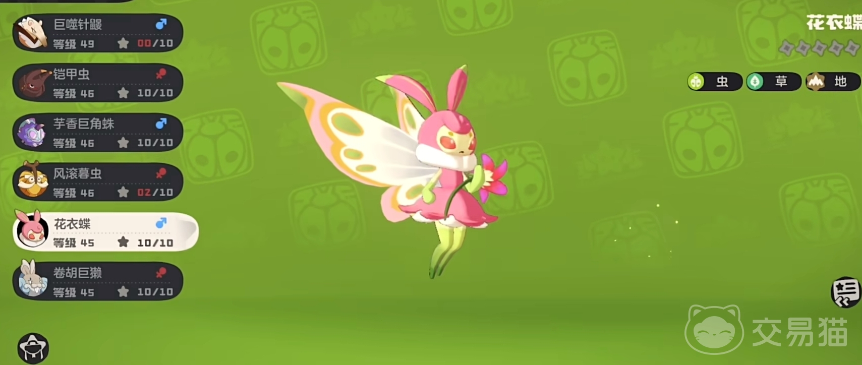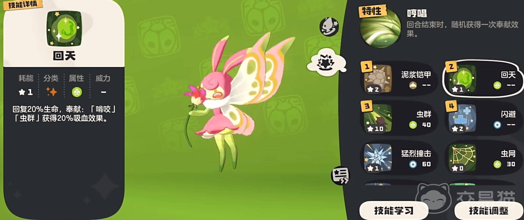花衣蝶作为虫队的中后期核心,可以用来撑场面,既拥有强力的攻击技能,也能施加多种减益效果。花衣蝶有两种主要的玩法,一种是简单的抗性流,以加抗性为主,另一种是搭配技能【泥浆铠甲】、【回天】、【虫群】和【闪避】。推荐携带【回天】技能的花衣蝶,可以通过吃一次威力较小的火系技能触发容错,搭配【泥浆铠甲】进一步提升防御力,增加生存空间。