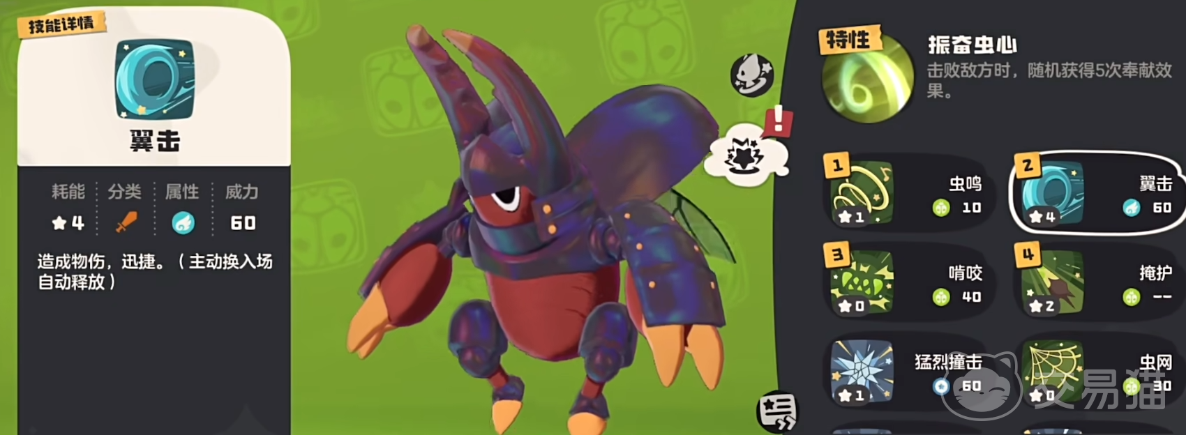 铠甲虫是虫队里当之无愧的收割位,凭借157点的高物攻成为版本的T0宠物。它即便单独上场也非常强大,性格推荐加物攻。铠甲虫通过【奉献】技能,每次击败敌人都会提升自身的攻击力,连招方面推荐【翼击】、【掩护】和【翼击】,配合吃到奉献的【啃咬】技能,可以打出非常高的伤害。