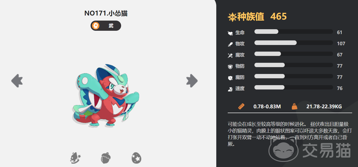 小怂猫是一种昼伏夜出的猫科精灵,胆小怕生,行动谨慎。由于其极少被观测到,曾一度被认为是已灭绝的物种。这种精灵带有萌系外表,但在战斗中却能发挥强大的作用。