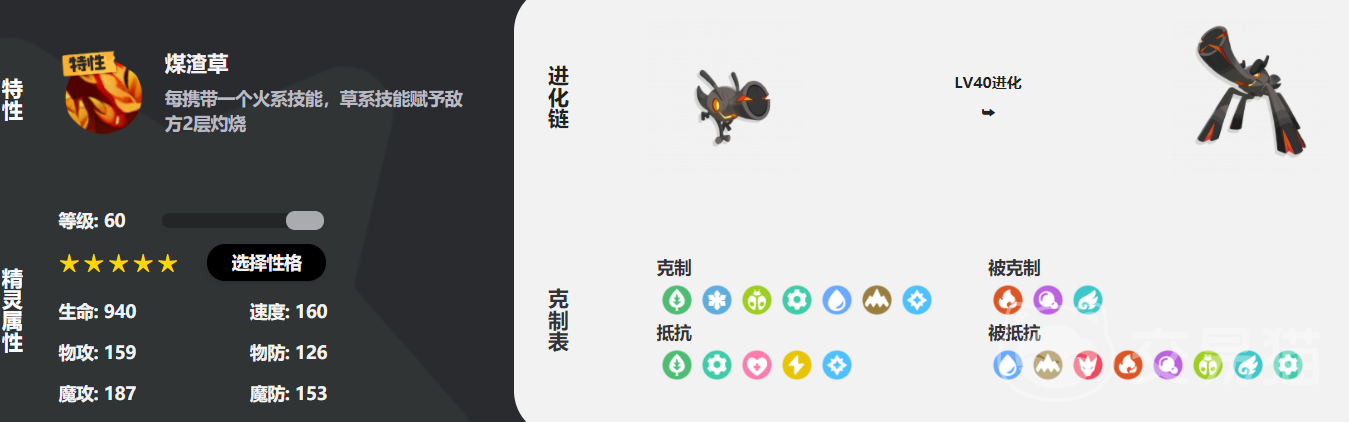 特性:煤渣草。燃薪虫每携带一个火系技能,草系技能便能额外赋予敌方2层灼烧效果。这使得燃薪虫在战斗中能够频繁叠加灼烧状态,为队伍创造更多输出机会。