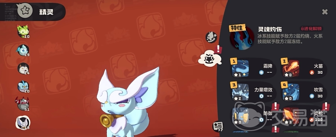 九尾狐作为一只火属性宠物,在面对草属性或者冰属性的敌方精灵时具有克制优势,九尾狐拥有多种强力技能,能够在战斗中发挥重要作用。其主要技能包括: