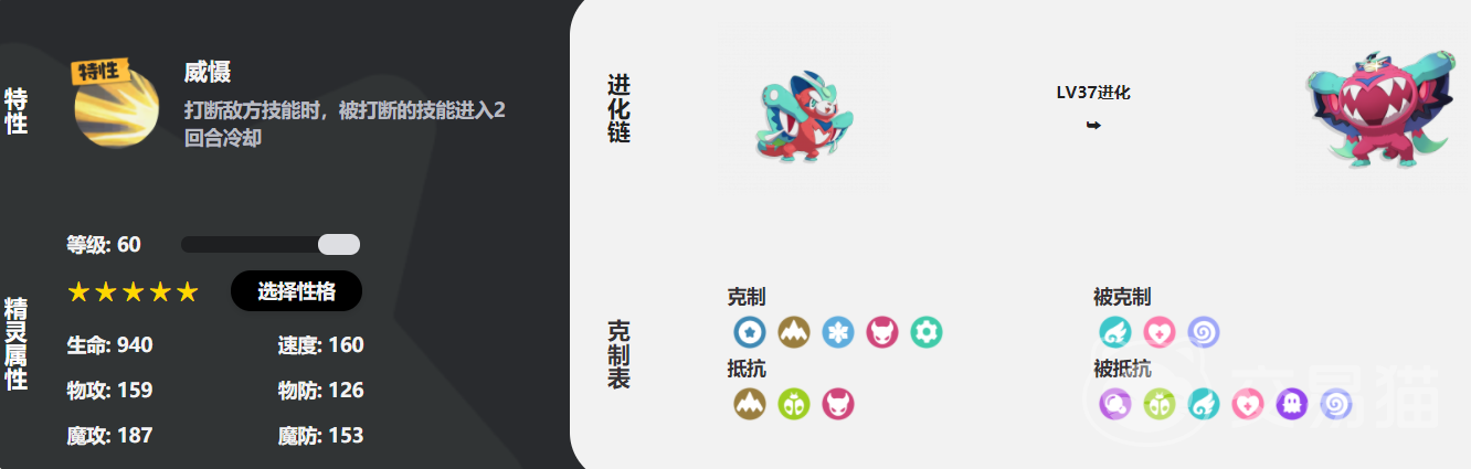 五星属性面板(60级):生命:940、速度:160、物攻:159、物防:126、魔攻:187、魔防:153。