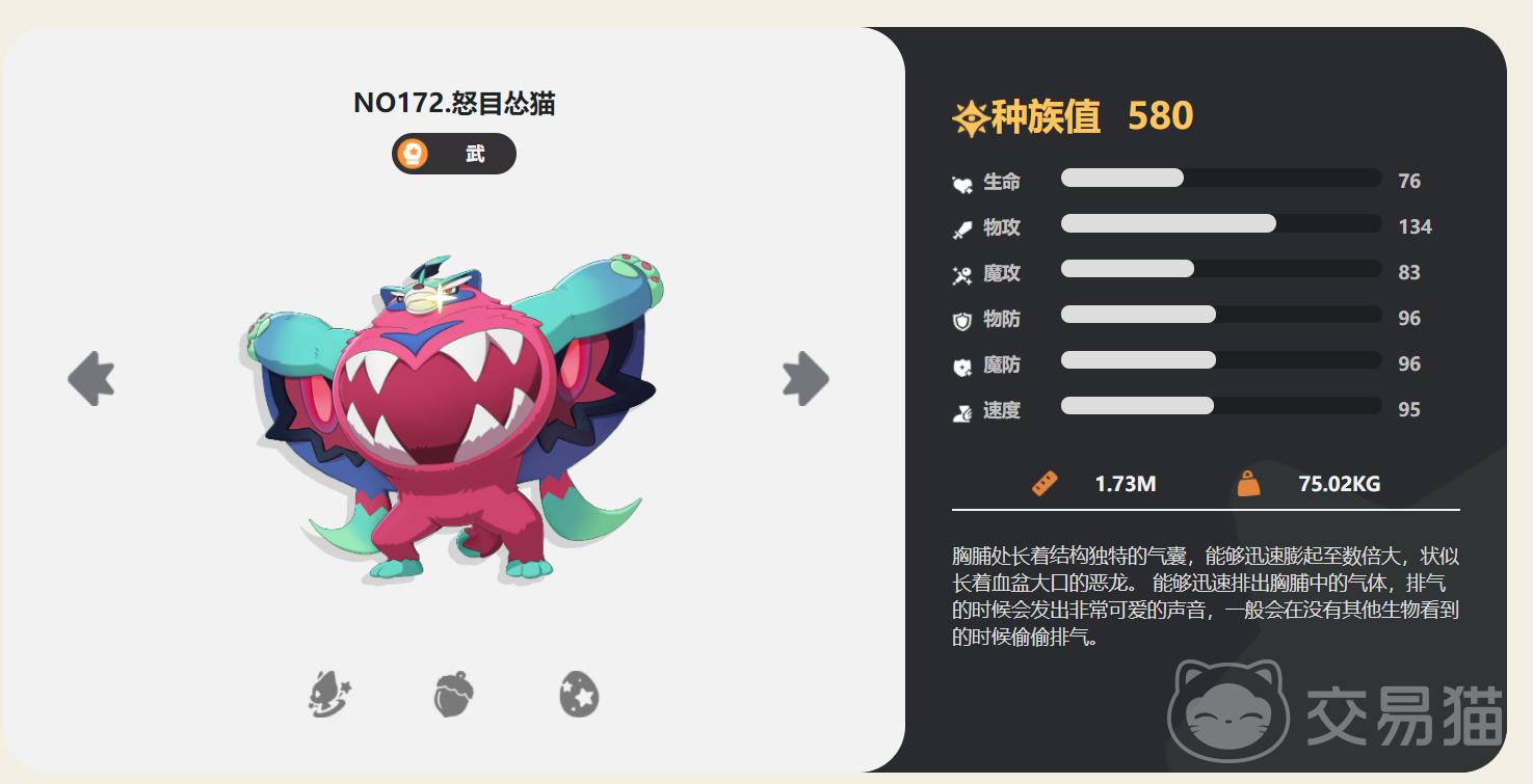 从属性上看,怒目怂猫在生命值、魔攻和速度上表现较为优异,同时其物攻属性也较为均衡,能够适应不同的战斗环境。