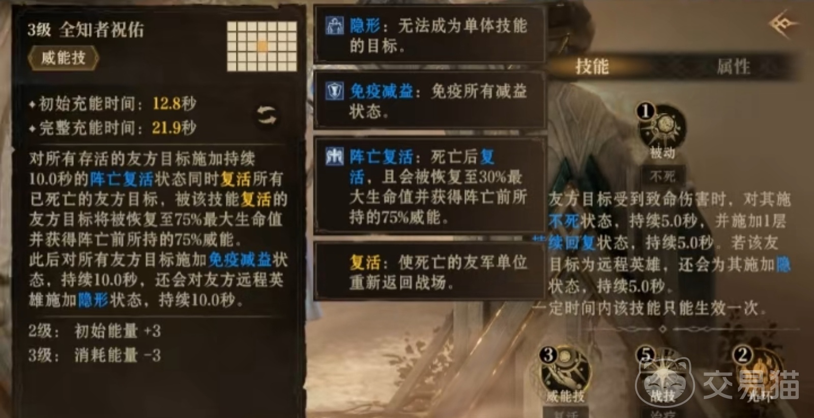 它的最终大招是威能技全知者祝佑,能对所有存活的友方目标,施加持续10秒的阵亡复活状态后,复活所有死亡的友方目标,被该技能复活的友方目标将被恢复至75%最大生命值并获得阵亡前所持的75%威能,此后对所有友方目标施加免疫减益状态,还会对友方远程英雄施加隐形状态,是一个集复活、恢复和免疫减益于一体的强大技能,在战斗中往往能扭转战局。