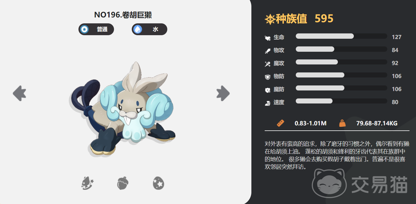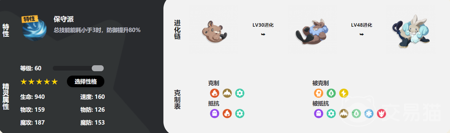 它的五星属性面板如下:生命:940、速度:160、物攻:159、物防:126、魔攻:187、魔防:153。从属性面板来看,卷胡巨獭的防御较为突出,是水系不错的防御宠物,尤其适合一些生存和续航需求较高的场景。