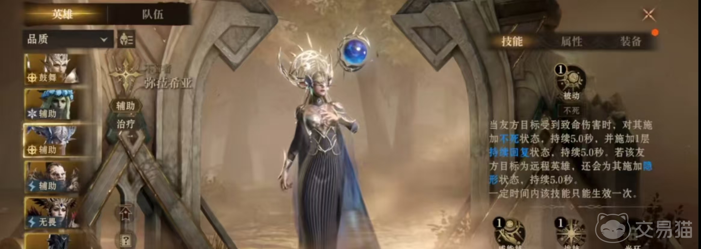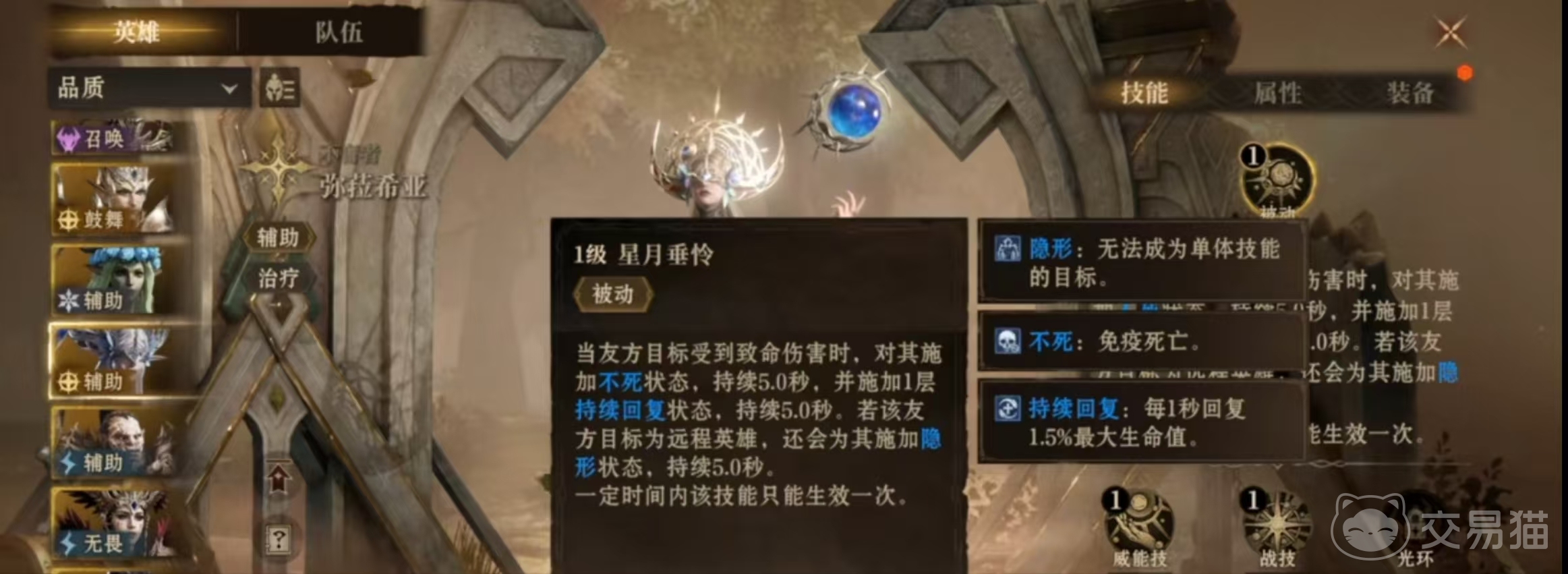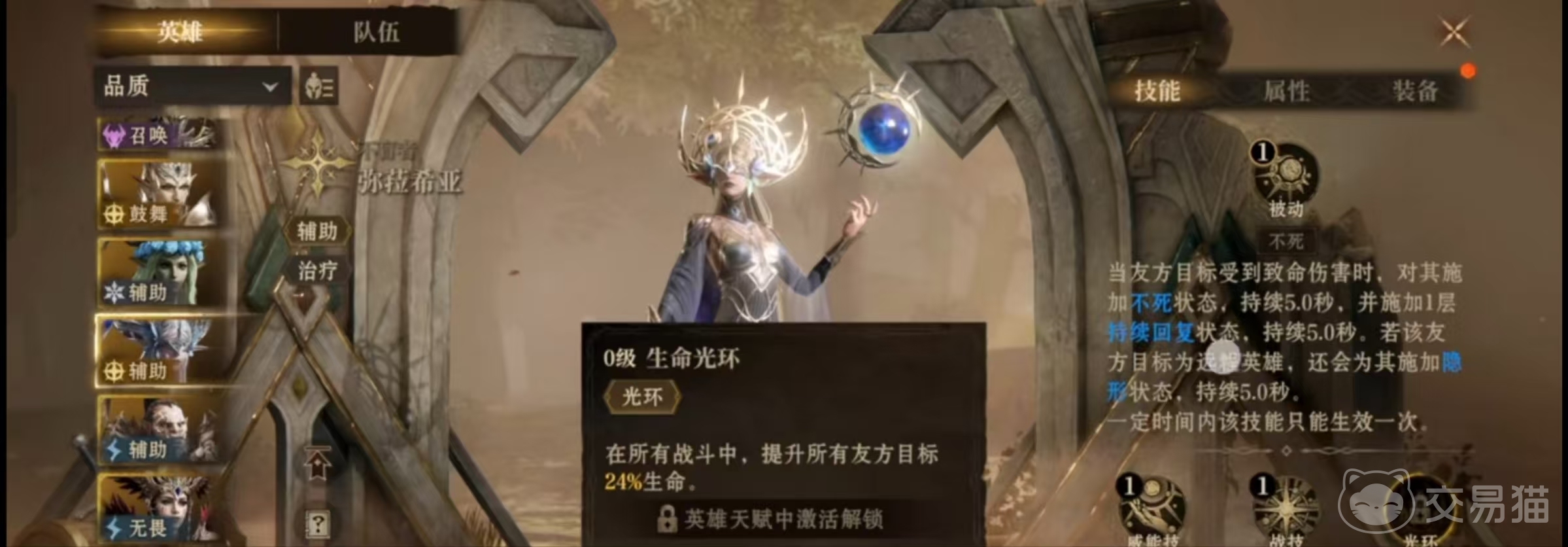 先他的被动技能是当队友受到致命伤害的时候,他能够是加持续五秒的不死状态并未其施加一层持续恢复状态。如果这款队友是远程英雄那么还可以增加隐形的效果,这样就无法成为单体技能的目标。那么他的另外一个技能还可以对范围内的队友进行治疗,随后还会对他们施加一层持续回复的状态,这样可以帮助持续回复生命值。对于他的威能技能够对场上所有存活的队友是加一个持续时秒的阵亡复活状态,这样就可以直接复活所有队友。而且被复活的友军能够恢复到75%的最大生命值,并且还能获得阵亡前所持有的75%的威能。还会对所有队友10秒的免疫检疫状态,队友方远程英雄是加十秒隐形。