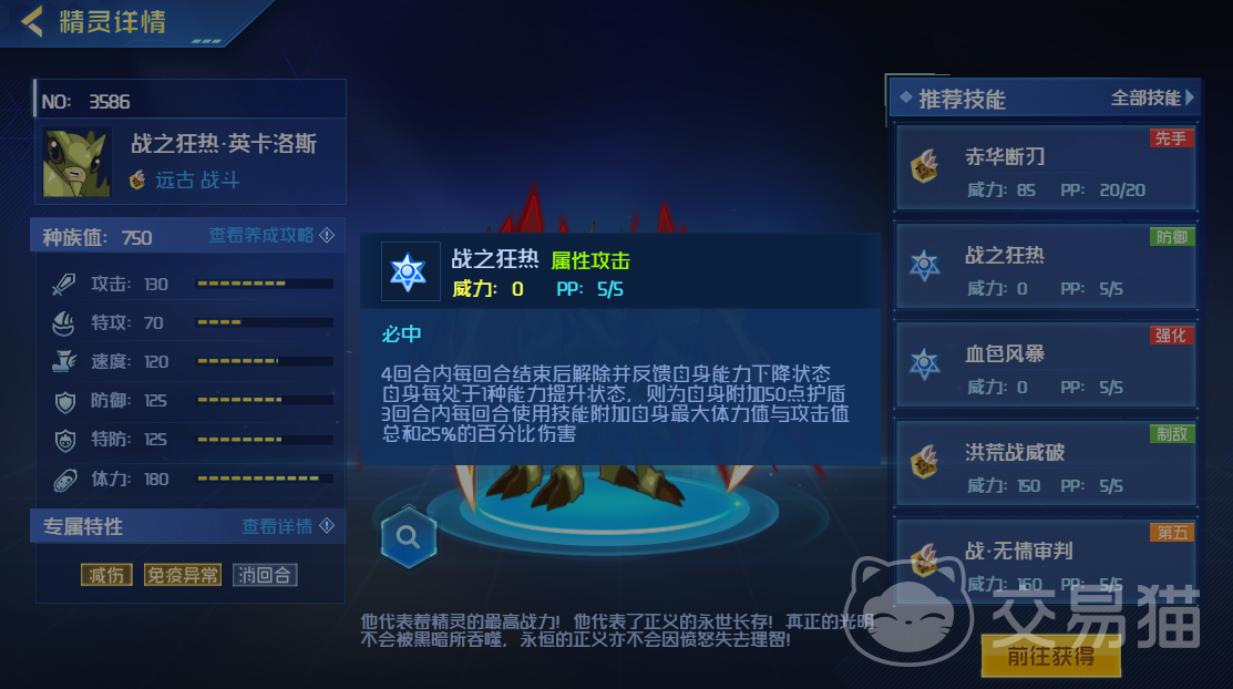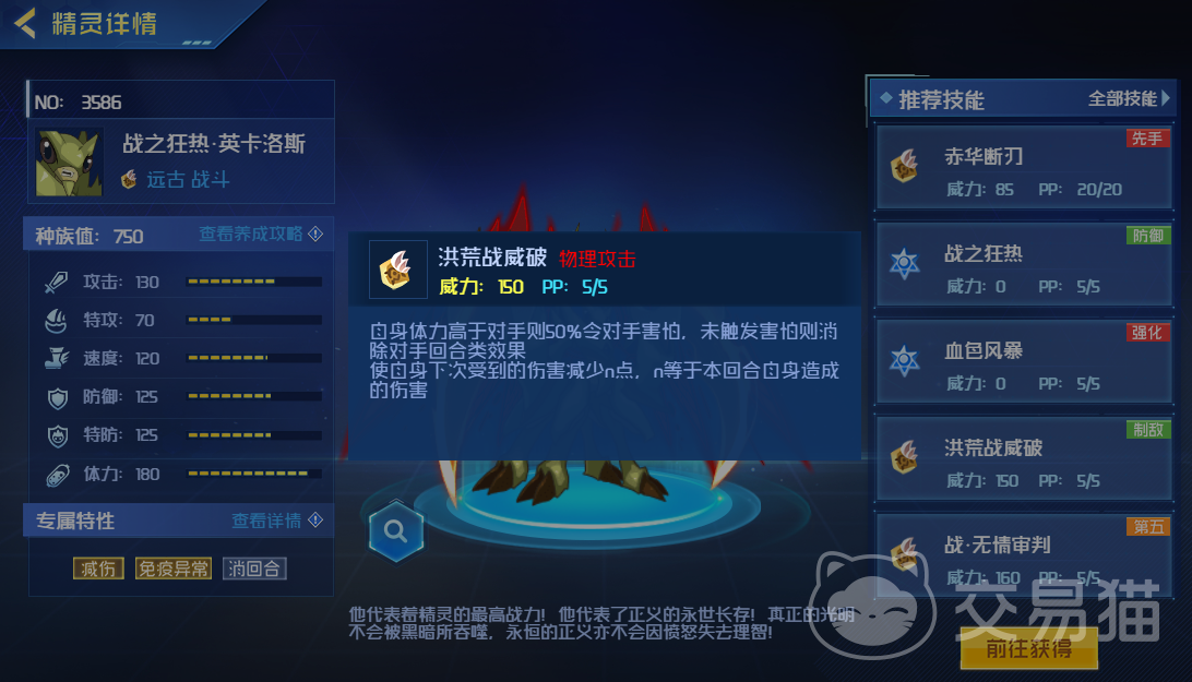 然后大招的话叫做洪荒战威破,如果自身体力高于对方的话,可以让对方处于恐惧状态。没有触发的话就会令自己下次受到更少的伤害,并对对方造成高额物理伤害。然后还有无情审判,用了后就可以消除对手的回合内增益状态,成功后对方无法用技能恢复体力。