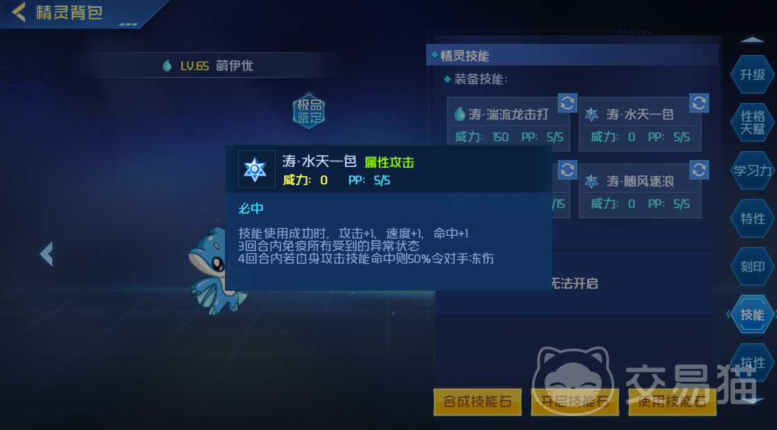 首先讲一下涛·水天一色,用的时候必定能够命中。并且增加速度攻击以及命中率,然后还可以免疫所有所受到的异常状态,并持续三回合。如果在四回合内自身的攻击命中对方的话,还有50%的概率冻住对方,所以是个优秀的先手控制手段。