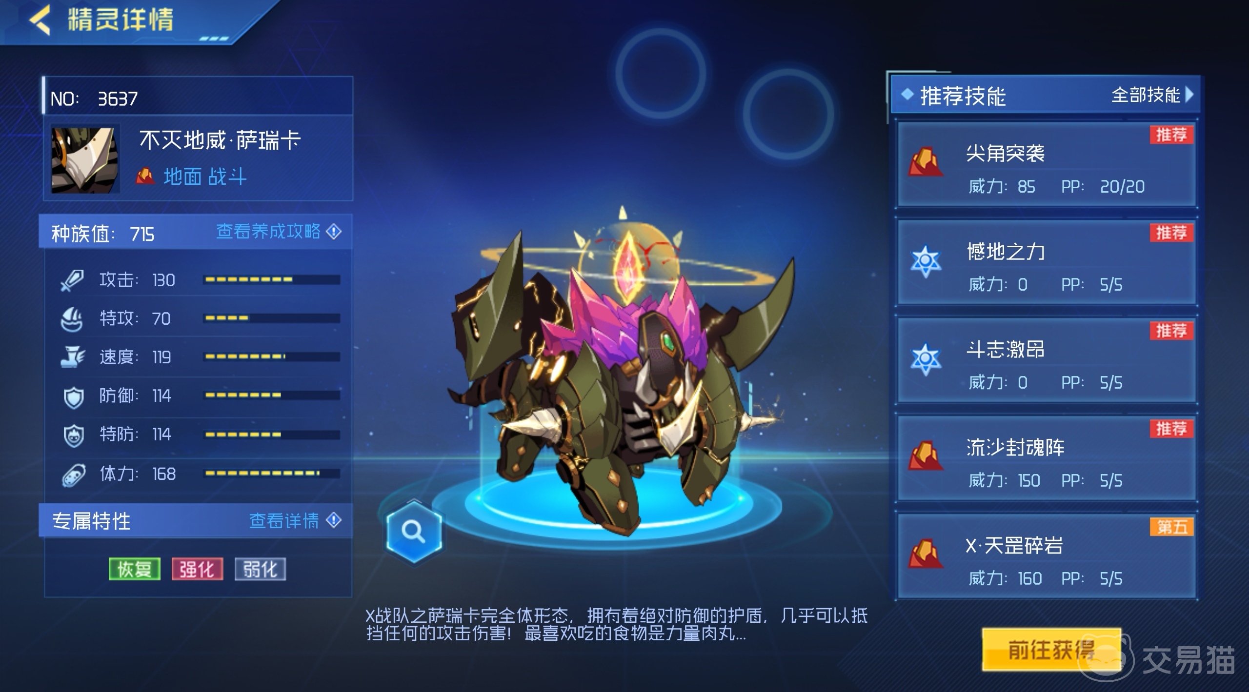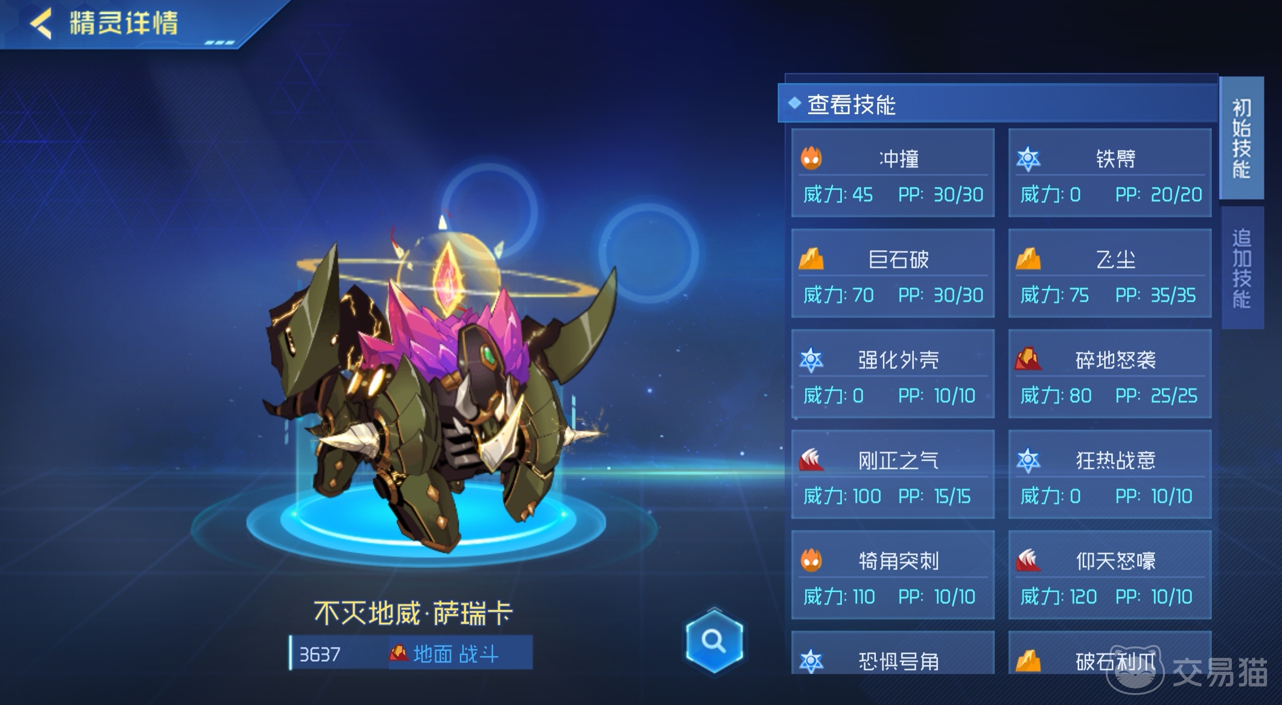 如果对方首发精灵没有明显的克制手段或控制技能,可以选择首发这个精灵,直接使用不动神威或磐石之力来进行强化和防御,然后根据对手的操作,针对性地使用尖角突袭或憾地之力进行控场和干扰,当把敌人限制住了,再去针对它的弱点进行持续进攻。