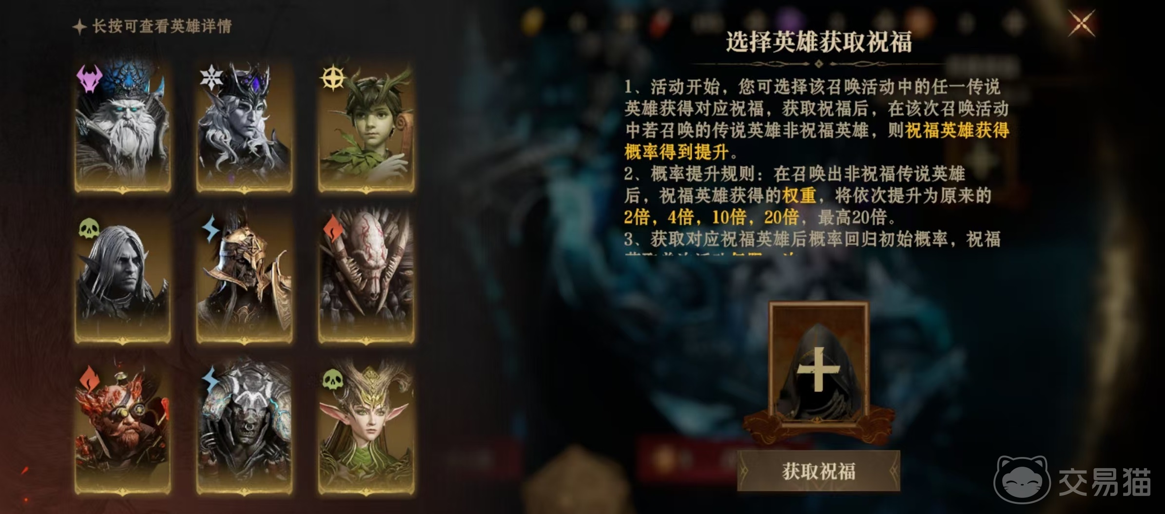 在太阳季轮召唤中,玩家可以选择祝福英雄,这样能提升获取该英雄的几率,获取祝福之后,在该次召唤活动中召唤的传说英雄,如果不是祝福英雄,那么祝福英雄接下来获取的概率得以提升。权重依次替换为原来的2倍,4倍,10倍,20倍,最多达到20倍。所以只要在这里选择好祝福英雄,大概率抽取一定次数后,就可以直接获得了。大家要做的就是规划好,然后选择正确的祝福英雄。