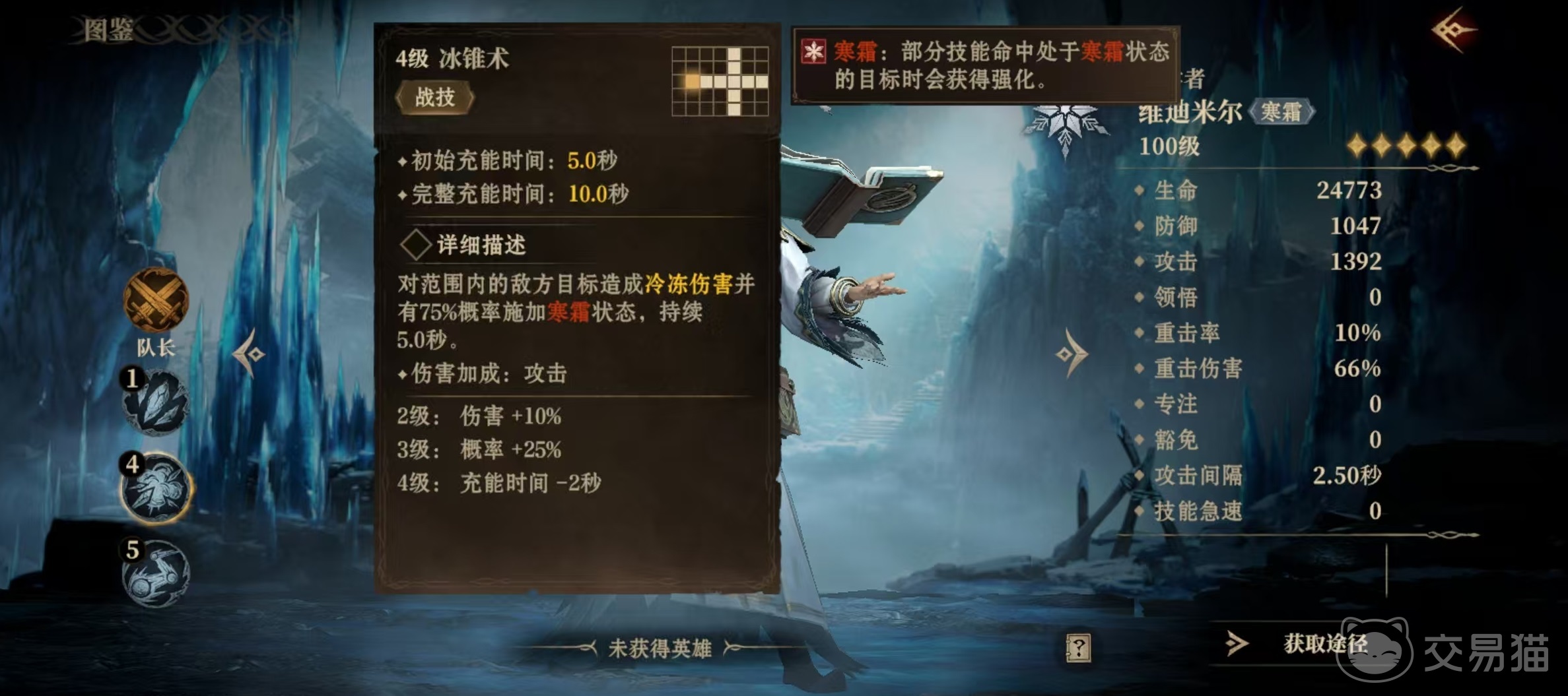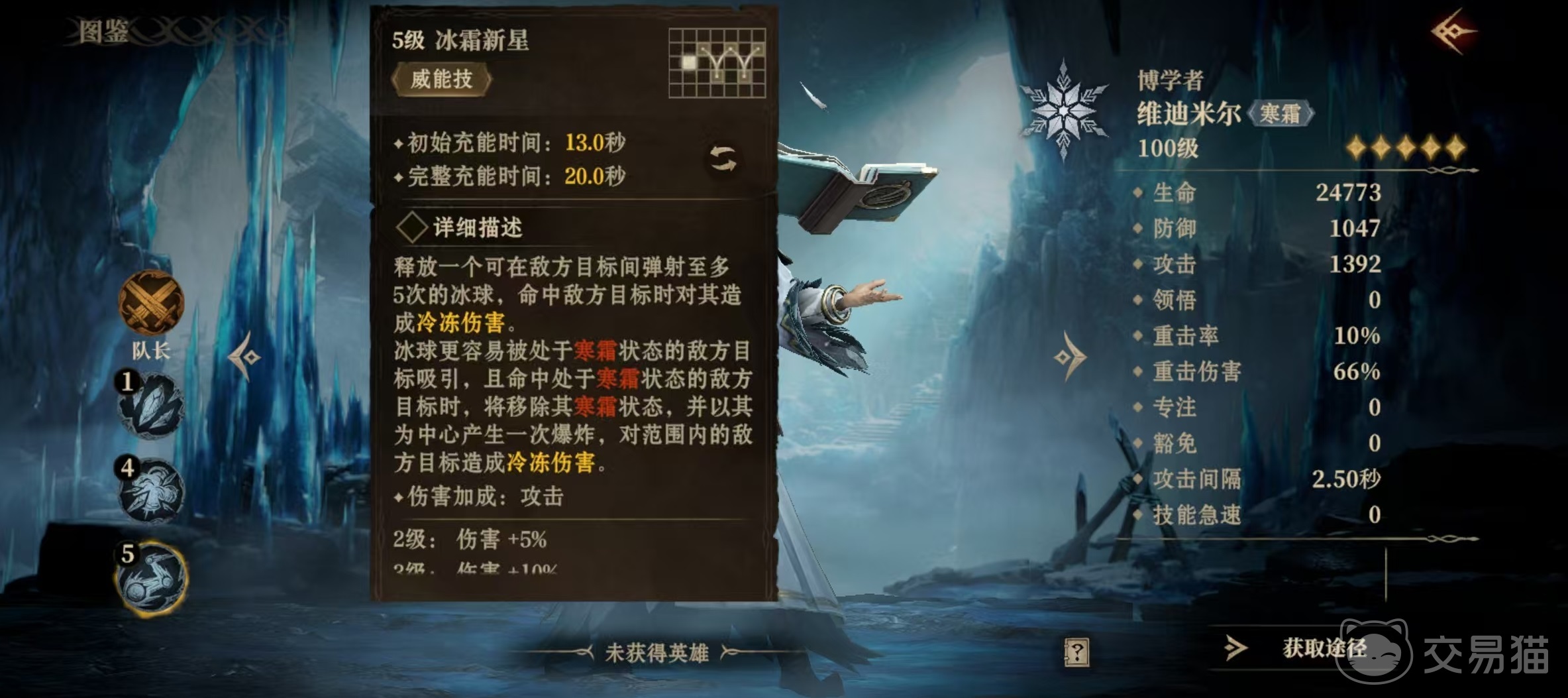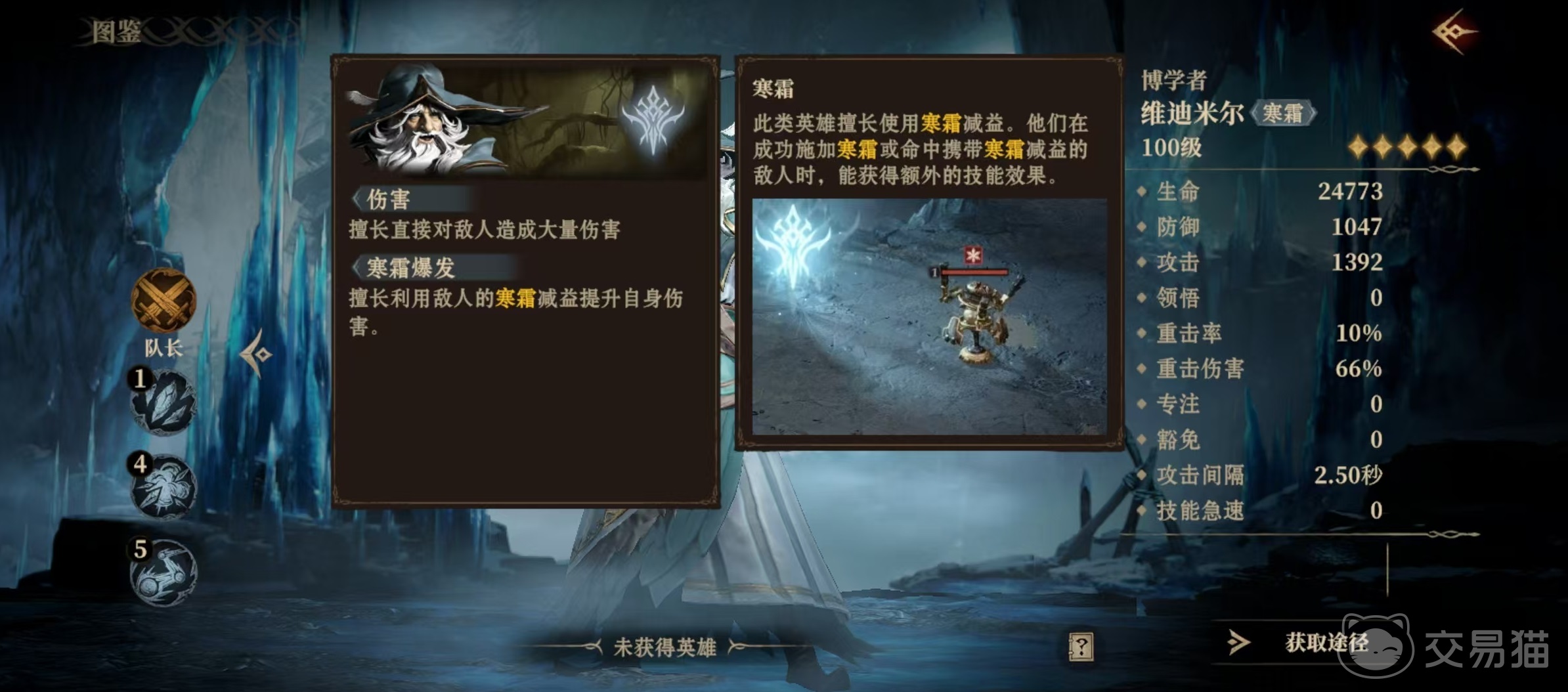 冰老头维迪米尔是属于寒霜属性,他擅长使用寒霜来进行控制,带来额外技能效果。队长技能攻击光环,所有战斗中都能生效,提升己方目标24%的攻击,属于比较中规中矩的状态类光环,可以根据情况选择。被动技能破冰,处于寒霜状态的敌方目标死亡时,自身将获得25%攻击提升状态,持续10秒钟,并增加15%威能。提升的攻击或许并不明显,但是提高了威能有利于释放出威能技,节奏大大加快了。