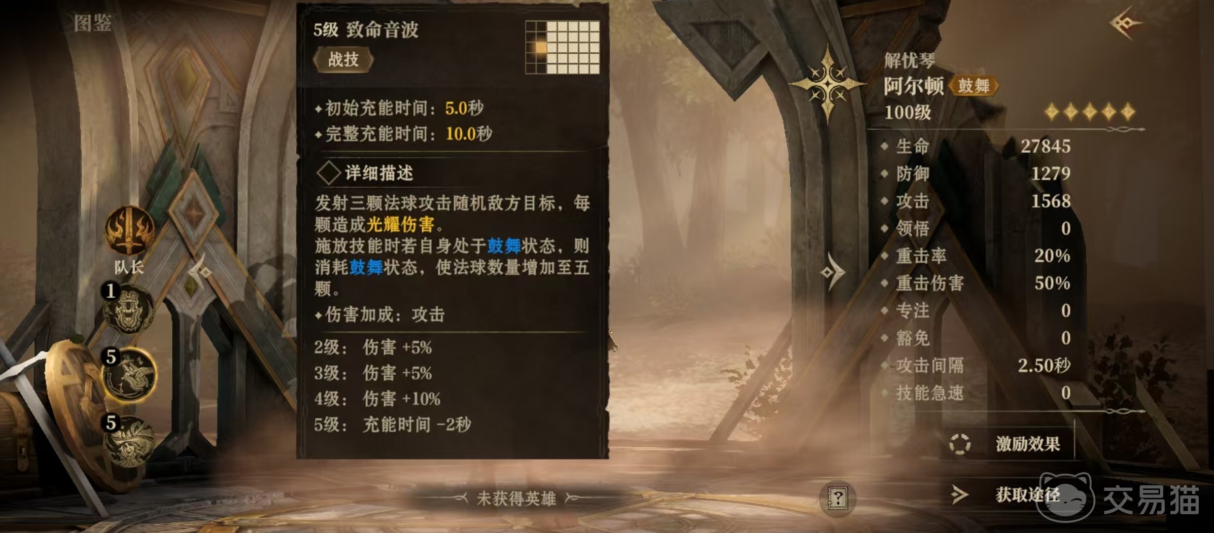 如果阿尔顿成为队长,那么他带来的是重击伤害光环,在所有战斗中都能提升有方目标30%重击伤害。重击伤害其实指的就是造成重击时的额外伤害,大家理解成暴击就可以了,该技能也有着广泛应用,所以成为队长也是不错的选择,被动技能可以鼓舞定位友方,试图释放可消耗鼓舞状态的技能时,如果目标已处于鼓舞状态,那么有50%几率获得30%伤害增加,持续10秒钟。如果其未处于鼓舞状态,则有50%几率获得鼓舞状态,并立刻将其用于技能的消耗。
