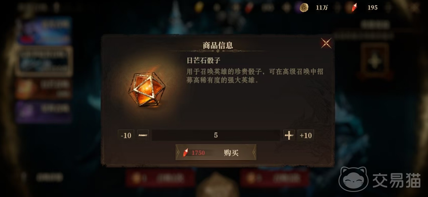 龙息神寂中,无论大家进行哪一池子的召唤,包括能选择英雄祝福的太阳季轮替召唤或者是常规池日芒召唤。以及限定出现的各种限定英雄池,使用的道具都是日芒石骰子。它是召唤英雄的珍贵骰子,获取的主要途径包括各种活动获得以及在商城中购买。游戏目前采用的是连续5抽模式,并没有10连抽,如果要进行一次5抽,需要消耗5个日芒骰子。