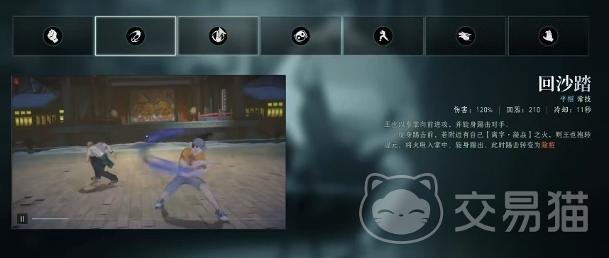 平招回沙踏是王也的基本攻击技能,以全掌为输出向前方发起连续进攻,并以旋身踢击结束。在有离字凝焱火存在的场地中,王也可以将火焰吸入掌中,使掌击造成额外伤害,不仅伤害可观,而且具有一定的控制效果,是王也在对战中常用的起手技能和追击手段。
