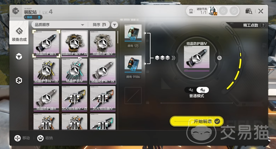 3、装备:装备是一个类似御魂的系统,带上同一系列的装备会触发它的额外效果。在野外开宝箱可以获得这些装备,这些装备也可以在基建中生产。生产装备的成本比较低,因此不是特别的肝。装备有使用者的等级要求,目前最高等级限制是40级,也就是只有40级及以上的干员才能穿戴。金色装备有办法在野外获取的,必须通过基建生产。在完成一定的基建科技后会解锁一个精工模式,玩家生产装备的设备每4个小时会增加一点精工点数,可以切换成精工模式来生产一些可以精加工的T4紫色装备,精攻成功以后,会扣除一点精攻点数,可以得到金色装备。金色装备除了数值和原先的紫色装备没有任何区别,不过这个数值也是随机的,但是它的数值提升有一定的幅度。