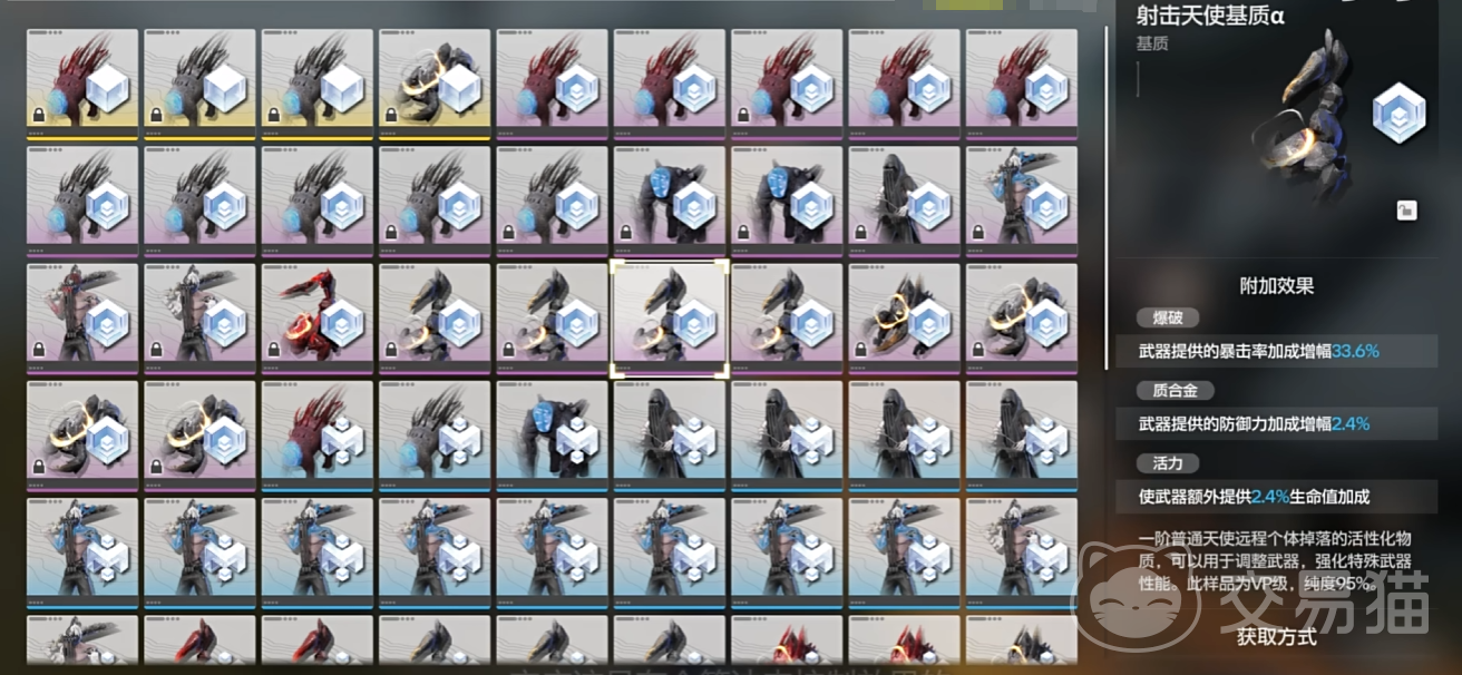 2、武器:该游戏的武器都会直接加算一些攻击力,然后在此基础上提供不同属性的百分比增幅,包括攻击力、生命值、防御力、破防力、暴击率和暴击伤害。然后除了数值的直接提升,还有一个武器被动技能,玩家可以从这个被动技能基本上推断出它更适合哪个角色。武器有两个养成点,武器也有独立的等级系统,通过消耗其他武器和武器升级经验包升级也是每十级就要突破一次。不过武器的特破是不需要吃同一个武器的,只需要吃那种普通的武器突破素材就好。其次是一个叫做活性化的系统,它允许问玩家的武器装备一个【基质】来进行强化,大家可以打这个功能理解成词条,不过是随机的吗,但是优先级是比较低的。基质可以通过打怪掉,从低到高分为绿色、蓝色、紫色、金色品质。其中金色品质的基质只能通过三个紫色同类机制合成而得。敌人等级越高,掉出来的品质就会越高。一般打40级以上的敌人就会爆紫色的基质。