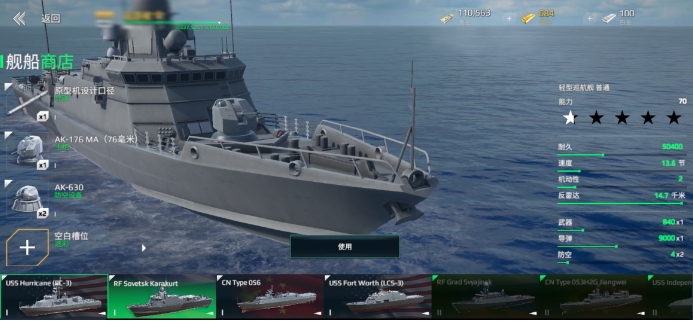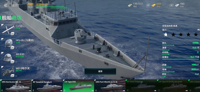 056型护卫舰是中国的一级船代表,其最大的特点是装备了直升机和全面的武器配置,主炮为HPJ-26,单发伤害达到1050,炮弹投射量为三连发。此外,还配备了长剑导弹,对敌方战舰和地面目标都有较好的打击效果。价格相对较高,但其全面的武器配置和较高的伤害值使其在多任务操作中表现出色。