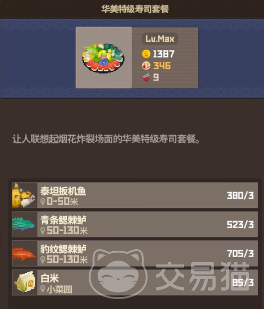 首先要说的是开局就非常值得尝试的“华美特级寿司套餐”。这道寿司不仅看起来高端大气上档次,制作也很朴实无华。需要的食材包括泰坦扳机鱼、青条鳃棘鲈、豹纹鳃棘鲈各3份,再加上白米3份,就能烹制出这道既实惠又高效的美味。满级后售价大约为1387金币一份,一次制作可以达到9份,是新手玩家最稳妥的选择之一。而且解锁条件也不复杂,只需要完成导演任务,就可以轻松获得这道菜谱。