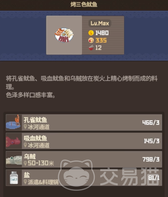 到了中期,你一定会爱上“烤三色鱿鱼”。这是一道简单粗暴又高产的赚钱神器,特别适合餐厅高峰时段使用。需要的食材包括乌贼、孔雀鱿鱼、吸血鱿鱼各3份,再加上一点盐。这道菜满级后单份售价为1480金币,一次能制作12份。特别是在餐厅客流量较大的情况下,它几乎可以应对所有需求。15级以上的玩家一定要安排上这道菜,尤其是36人夜市和45人高峰时段,表现非常出色。