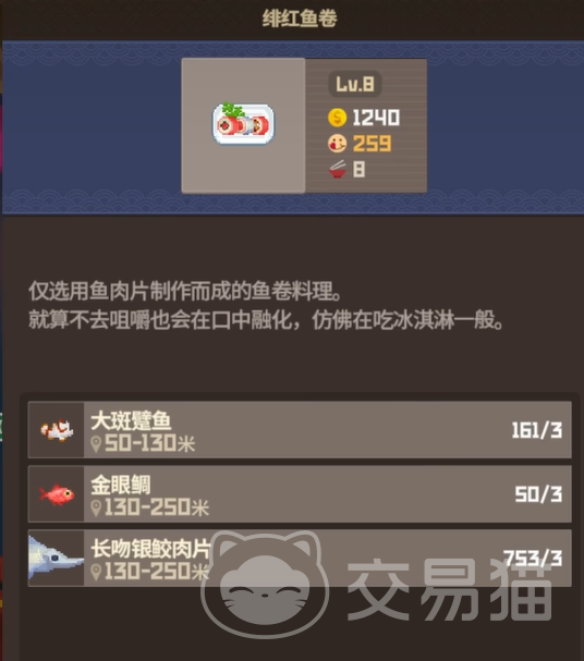 接下来不得不提性价比之王——“绯红鱼卷”。它是一道从中期用到后期都很实用的经典料理,适合追求高效率的玩家。制作所需的食材包括长吻银鲛肉片、金眼鲷鱼和大斑躄鱼各3份。这道菜满级后的售价高达1480金币一份,并且一次能制作9份。更棒的是,员工“比利”升到15级后就可以解锁这道料理。对于想快速提升收入的玩家来说,这绝对是一道不能错过的菜品。别小看这些普通鱼类,早期多储备一点,到后期你会感激自己的远见。