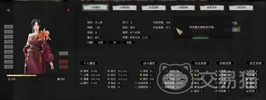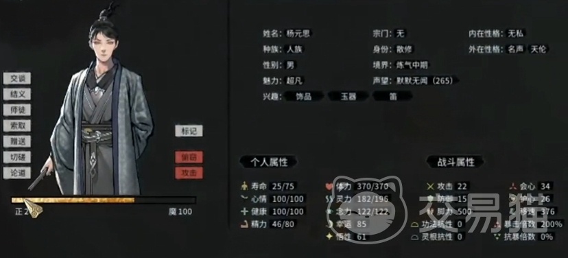 论道中的问题大多围绕修行哲理、道德取舍或正邪对立展开,玩家需要根据NPC的性格特征来选择合适的答案。判定的核心在于性格匹配,例如仁善、正直、无私代表正道,狂邪、利己、邪恶则偏向魔道,而中庸往往游走于两者之间。理解这些性格的内在逻辑,是在论道中取得成功的关键。