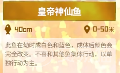 皇帝神仙鱼喜欢在水深0到50米之间的区域独自巡游。幼鱼时期,它们拥有白色与蓝色交织的外观,而成年后会展现截然不同的艳丽色彩。这种变化让它们成为许多玩家心目中的收藏目标。但要注意,皇帝神仙鱼一向独行侠,不会和其他鱼类群游,想找到它得擦亮双眼。