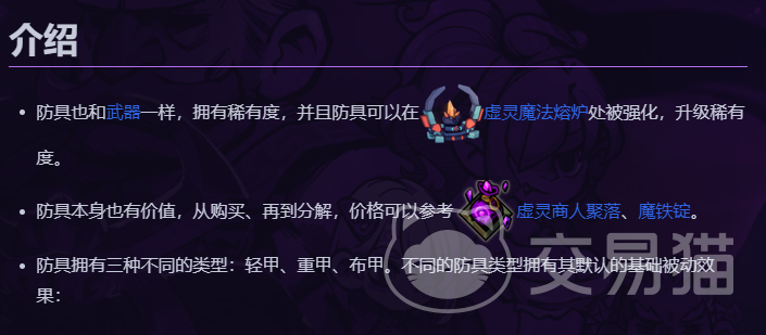屠魔者重铠:增加生命值和防御力,对近战武器有额外加成,适合近战坦克角色。