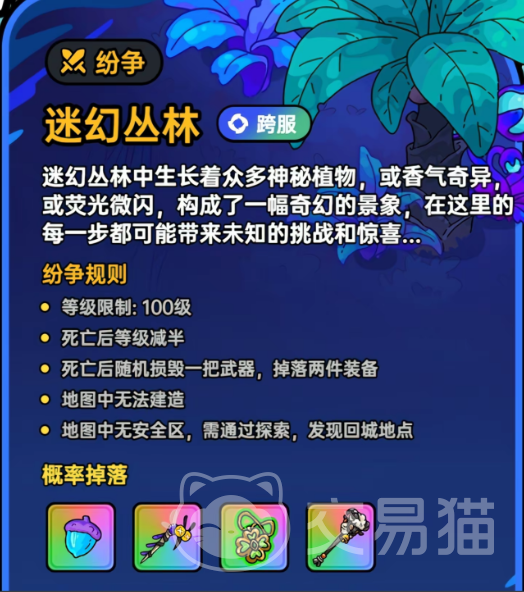 迷幻丛林一共有两种进入规则,一种是庇护而另外一种则是纷争,庇护的话也是允许玩家pvp的,但是死亡之后会有30秒禁止走出安全区的冷却,而且在地图内没有办法建造像火堆或者是弹板等建筑物,相对于纷争来说地图里面的怪物比较少,而且宝箱的资源也比较差,获取的橡木果实单次也就是两到三个,而纷争的话在死亡后会随机损坏一把武器并且掉落两件装备,对于很多萌新来说非常伤,即使达到了狮王二段位也不要随意进。