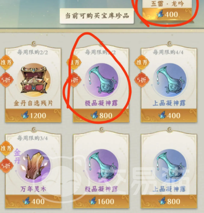 大家如果想要更快升级修炼的话,那就一定要拥有大量的凝神露。最简单的方法就是在商店里面购买,例如遗迹宝库。需要花费800点玉石,就可以直接获得一瓶极品凝神露,400玉石就能获得上品凝神露。