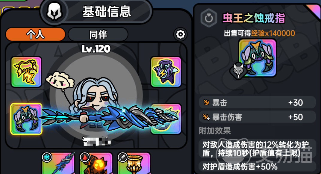 虫戒全名叫做虫王之蚀戒指,达到野狼一段位就可以穿戴了,基础属性是增加30点暴击和50点暴击伤害,但是附加效果比较万金油,对敌人造成伤害的百分比可以转化为护盾,而且对护盾还会额外造成一半的伤害,他这个护盾存在时长长达十秒,也就是玩家可以一直保证只要有输出就能不掉血,绝大多数的boss挑战中带虫戒甚至能达到单挑无伤通关。