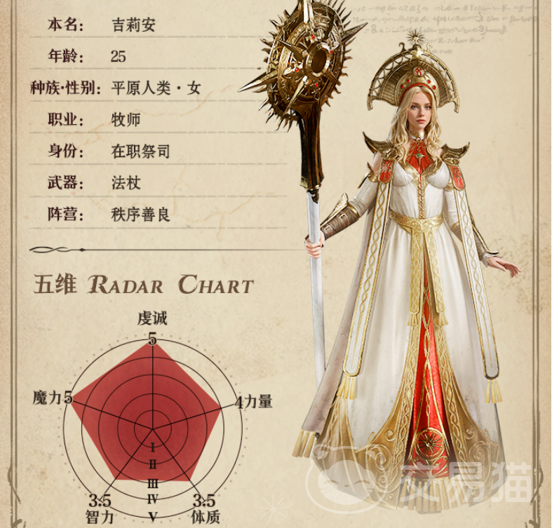 这是一名骑士职业的角色,五维属性都达到4点以上,属性发展相当的全面,是个各方面均衡发展的英雄,在战斗中的适用性很高,能力也非常的出色。被动”骑士精神”,在威能技释放后,有一定概率对随机的1个己方对手施加鼓舞状态,并持续一段时间,该效果让他在鼓舞阵容里面有比纯粹的输出英雄更为丰富的功能。