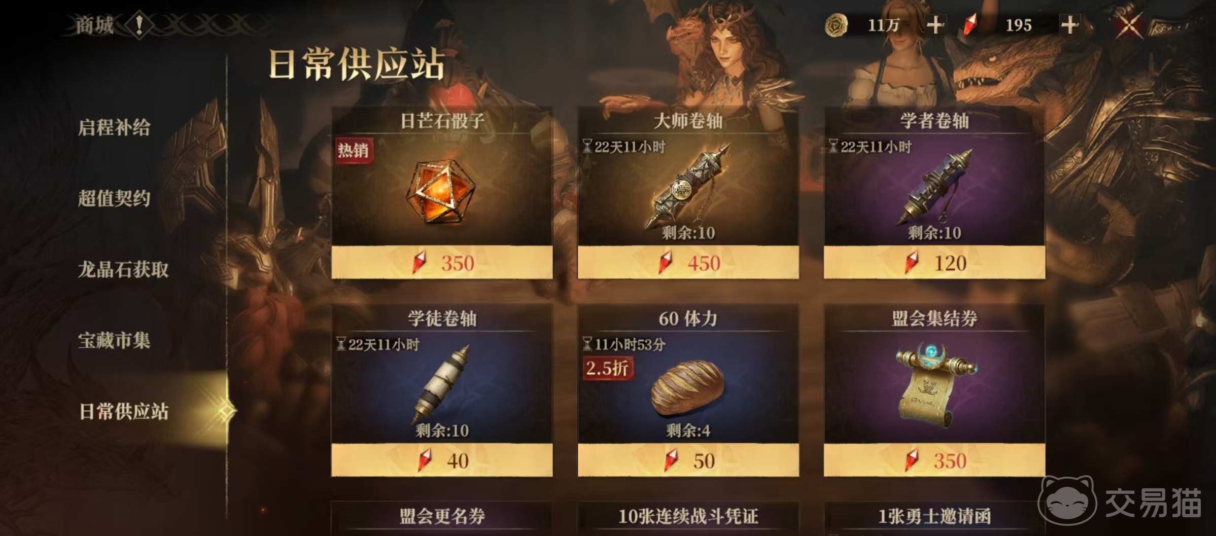 而其他充值所获取到的龙晶石,就是在商城中购买各种道具,首先是每个赛季的启程补给都要买下来,因为启程礼包赠送的都是赛季比较强势的英雄,还有大量日芒石骰子等抽卡道具,这也是性价比很高的礼包。在日常供应站中,需要消耗部分龙髓石来购买体力,连续战斗凭证以及金币等,这也是游戏中很重要的资源,龙髓石不够就拿龙晶石去换,这也是不能缺少的。