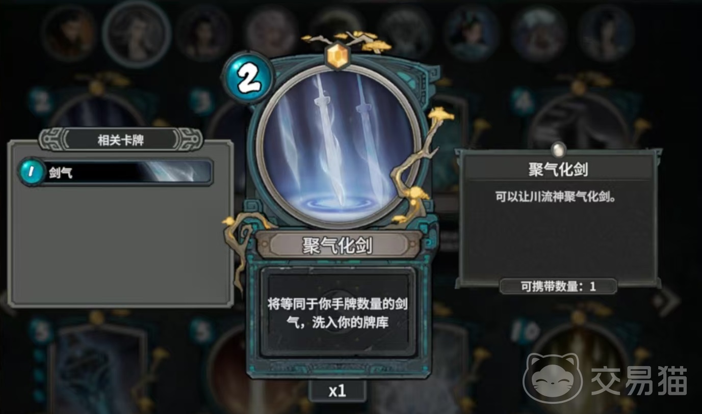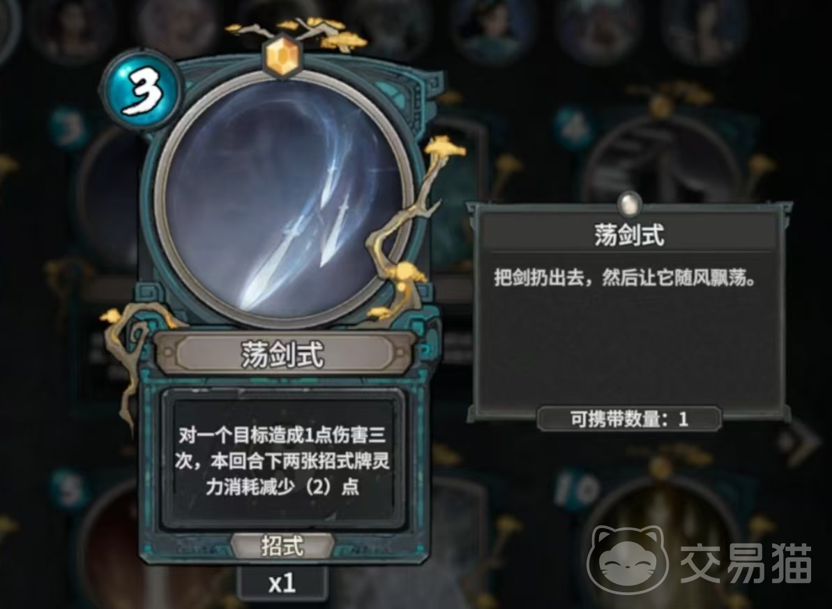 第1张卡牌聚气化剑,将等同于手牌数量的电器洗入牌库,这张卡牌目前虽然并不强势,但是未来可期,如果剑气流起来之后,这张牌绝对是一张很好用的卡牌。第二张荡剑式,对一个目标造成一点伤害三次,本回合下两张招式牌灵力消耗减少两点,比较中规中矩的卡牌。如果想玩招式剑,那么这张牌也是比较不错的。