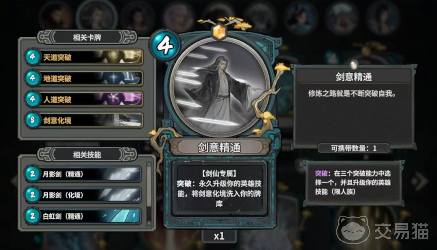第3张牌是飞剑阵,当使用招式后造成三点伤害,随机分配给所有敌方单位,这张牌经常用于创造奇迹,也是玩招式剑卡组中不可缺少的一张牌,缺点在于4费比较拖节奏。第4章突破,属于剑仙专属,突破后永久升级英雄技能,将建议剑意洗入牌库。突破指的是在三个突破能力中选择一个并且升级英雄,是属于人族专属能力。可以说剑仙的突破还是非常不错的,剑仙一技能三阶真的非常强,只要对面有杂鱼怪,就可以打出高额的伤害。虽然突破也有点拖节奏,但是三阶突破技能强,所以评分很高。