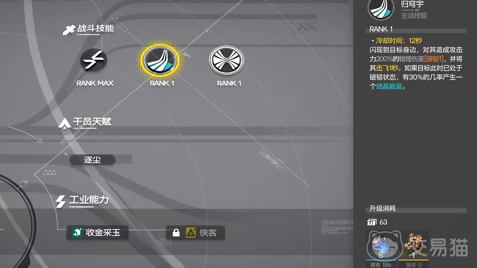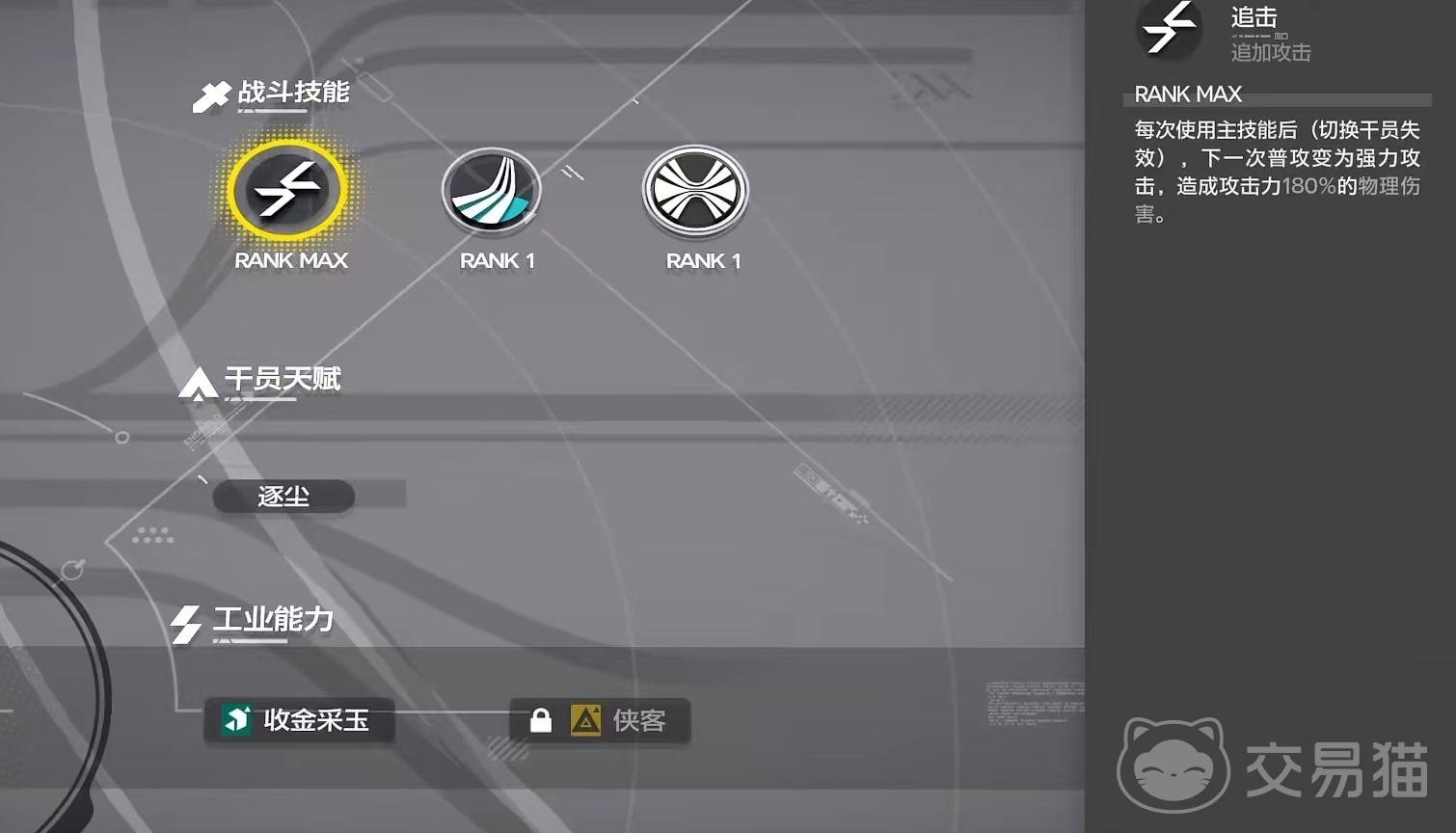 自身所具有的干员天赋是逐尘,对浮空状态下的敌人造成的伤害提高20%,所以应该积极地利用各种浮空技能,这样才能发挥天赋的优势。工业能力方面具有收金采玉和侠客这两类,收金采玉能够在进驻协议核心时,采掘非原石类矿物时效率提高15%。侠客是在建筑制造经验类产品合格效率增加8%,但需材料需求也会增加。