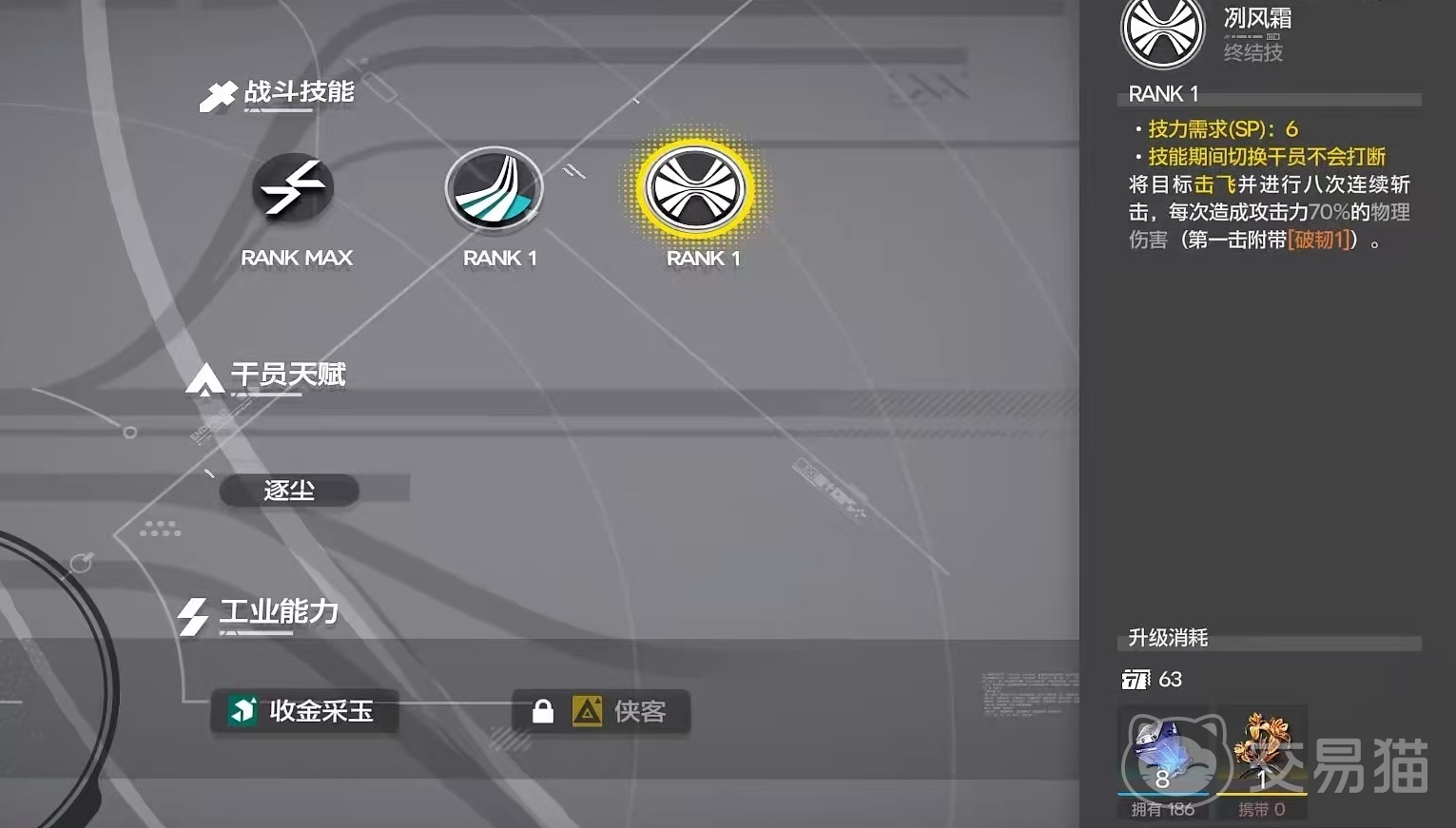 它所具有的战斗技能有以下几个第1个追击,在每次使用主动技能后,下一次普攻变为强力攻击,能造成攻击力180%的物理伤害,切换干员后失效。第2个是主动技能归穹宇,闪现到目标身旁,对其造成攻击力200%的物理伤害,并将其击飞一秒钟,如果目标此时已处于破韧状态,还有30%几率生成一个结晶能量。第3个是终结技冽风霜,在技能期间切换干员不会打断将,目标击飞并进行连续8次斩击,每次都能按照攻击力的70%来造成物理伤害,第1击还将附加破韧效果。