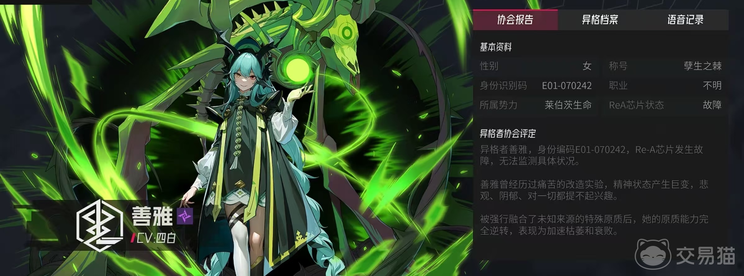 根据目前伊瑟重启日中所公布出来的这些角色外形,大家不难发现,其实绿头发角色指的就是善雅。善雅是属于恒定源质属性的sr稀有度人物,属于超链者协会,称号是净善之女。善雅曾经是一所孤儿院的孤儿,后来和人类形成了收养关系,她性格孤独但能量波动稳定温和,循环不息,如同本人一样温柔和煦,可以抚平伤痛,展现出了强大的治愈能力,这些能力也体现在了她的技能中。