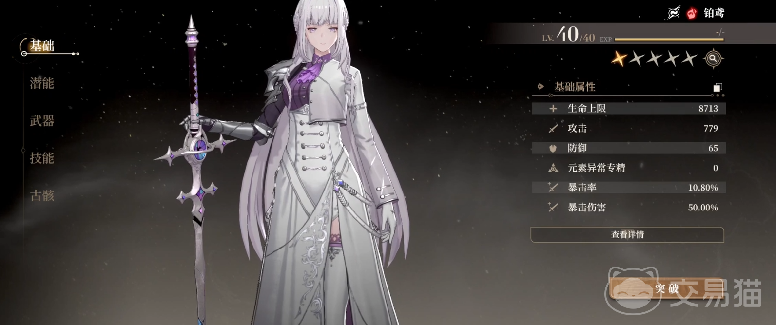 铂鸢是游戏里为数不多的已公开的SSR级别角色,她的武器是一柄长剑,在初始状态满级的情况下能有八千七百点的生命值上限以及高达七百八十点的攻击力,在不触发暴击的情况下都能做到如入无人之境,并且因为血量足够厚,更能满足她去和敌人近身战斗的条件,不会出现那种高攻低防,还没来得及输出就被集火秒掉的尴尬情况,她的暴伤属性也很高,往往能打出一刀999的感觉,对喜欢暴力输出的玩家们来说确实很不错。