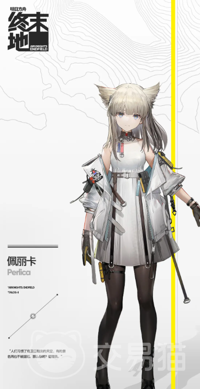 佩丽卡是工业的监督,负责依照领导者的计划,指挥并落实相关的工作,她能够非常果断冷静的应对各种危机,虽然需要经常奔波在各个据点,但为了组织的平稳发展,她一直是竭尽全力的,佩丽卡是一个近战类角色,拥有强大的单体攻击,她的技能协议雷击,能在对敌人形成高额脉冲伤害的同时具备破韧效果,再加上被动能在一定条件下提高能量的生成概率,使得其作战能力能不断增强。