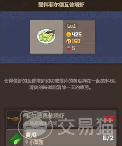 醋拌普塔虾整体的价格同样也是非常高的,需要应用到水生植物以及普塔虾,游戏当中各种水生植物的获取难度是相当高的,因此这道菜在制作时极其不易,最终决定了昂贵的价格。海藻炖平鳍旗鱼。同样也需要利用到水生植物作为配菜,不仅获得难度较高,最重要的是日常供应也需要依赖筹码升级较为困难,所以也是游戏当中被称之为最贵的料理。